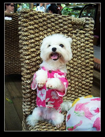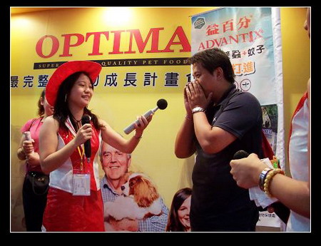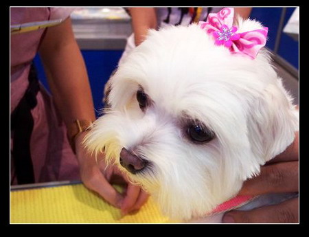 在DOG NEWS攤位,美容師幫IO綁了一個大花...